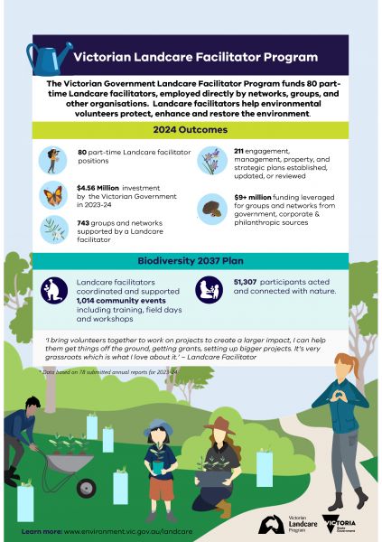 Since 2011, the Victorian Government has invested $56 million in the Victorian Landcare Facilitator Program (VLFP). It funds part-time Landcare facilitators who are employed directly by a range of organisations.